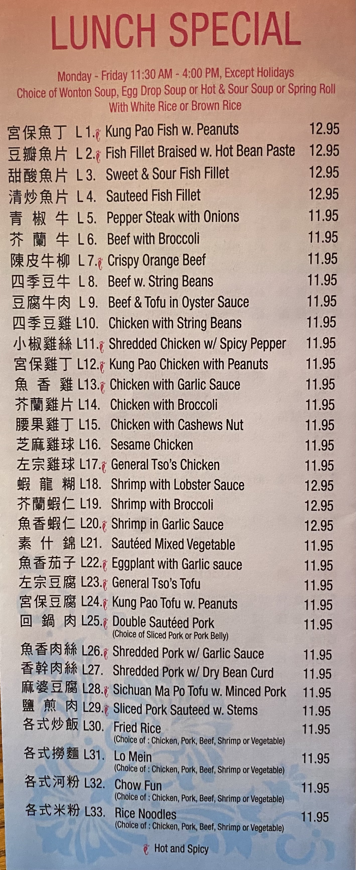 Monday – Friday 11:30AM – 4:00PM, Choice of Wonton Soup, Egg Drop Soup or Hot & Sour Soup or Spring Roll with White Rice or Brown Rice. Tel: 917-441-4790 包括馄炖汤,蛋花汤,酸辣汤或者春卷,白饭或者糙米饭 订餐电话: 917-441-4790